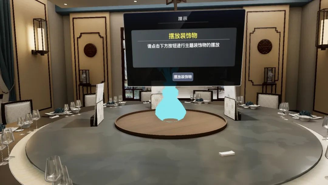该系统能够通过VR技术为学员创建高度真实的中餐餐厅环境,并在虚拟空间中模拟不同的摆台情境和服务流程。学员可以在系统中反复练习,从而在真实工作中更好地掌握中餐摆台技巧,提高服务质量与客户满意度。